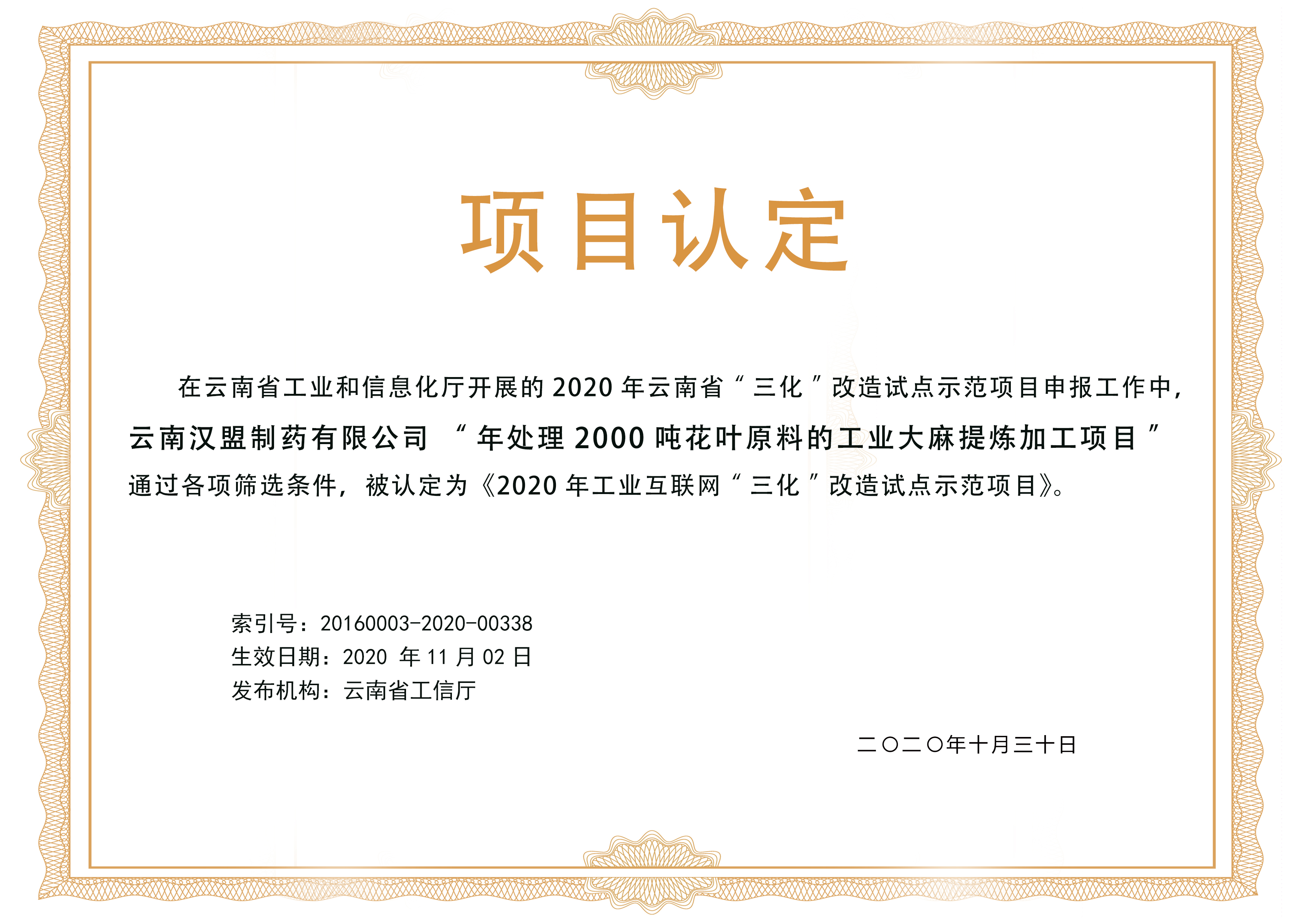 Recently, Yunnan Hempmon Pharmaceuticals Co., Ltd. (hereinafter referred to as “Hempmon CZ”)’s annual extraction and processing project of 2,000 tons of hemp has been recognized as the pilot demonstration project of “Industrialization, Standardization and Scientification” in Yunnan Province. The certification standards for the pilot project covered corporate digital equipment application and levels of interconnection, the basic conditions for “Industrialization, Standardization and Scientification” like the digitalization of production, management and decision, as well as the enhancement of project quality and efficiency, independent innovation level and construction cycle. This project is the first project related to CBD extraction recognized by the Yunnan Provincial government.